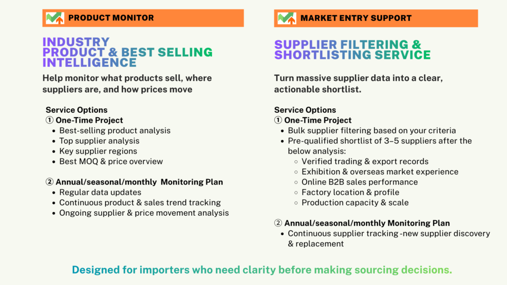 We act as your big-data product selection and supplier-scouting navigator. Instead of searching blindly across countless platforms, with our structured analysis, transparent process, we help you see the full picture, compare options easily, and make confident sourcing decisions faster.